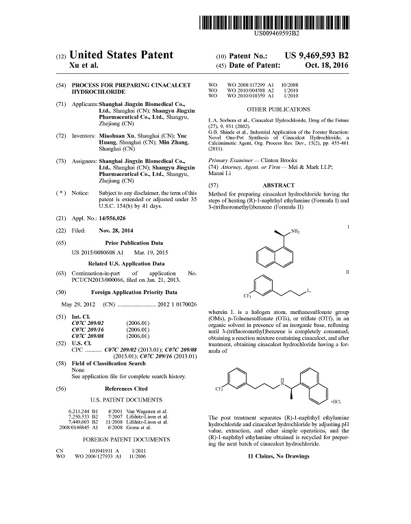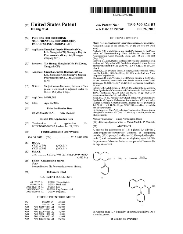 近日,公司的PCT專利申請:PROCESS FOR PREPARING (1S)-1 -PHENYL-3,4-DIHYDRO-2(1H)-ISOQUINOLINE–CARBOXYLATE獲得美國專利商標(biāo)局(USPTO)頒發(fā)的發(fā)明專利授權(quán)證書。專利授權(quán)公告號US9399624,為公司首件通過PCT途徑獲得國外授權(quán)的發(fā)明專利。